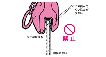 ★吊裝帶涂層的鋼材等物件時,即使旋轉顎及凸輪的磨損在允許限度內,也請務必使用齒部無磨損且已徹底清除堵塞物的鋼板起重鉗進行作業。