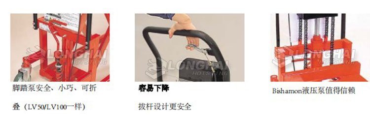 3、Bishamon手動剎車升降機有兩種升高方式:手動式和腳踏式,腳踏泵可折、小型、安全;